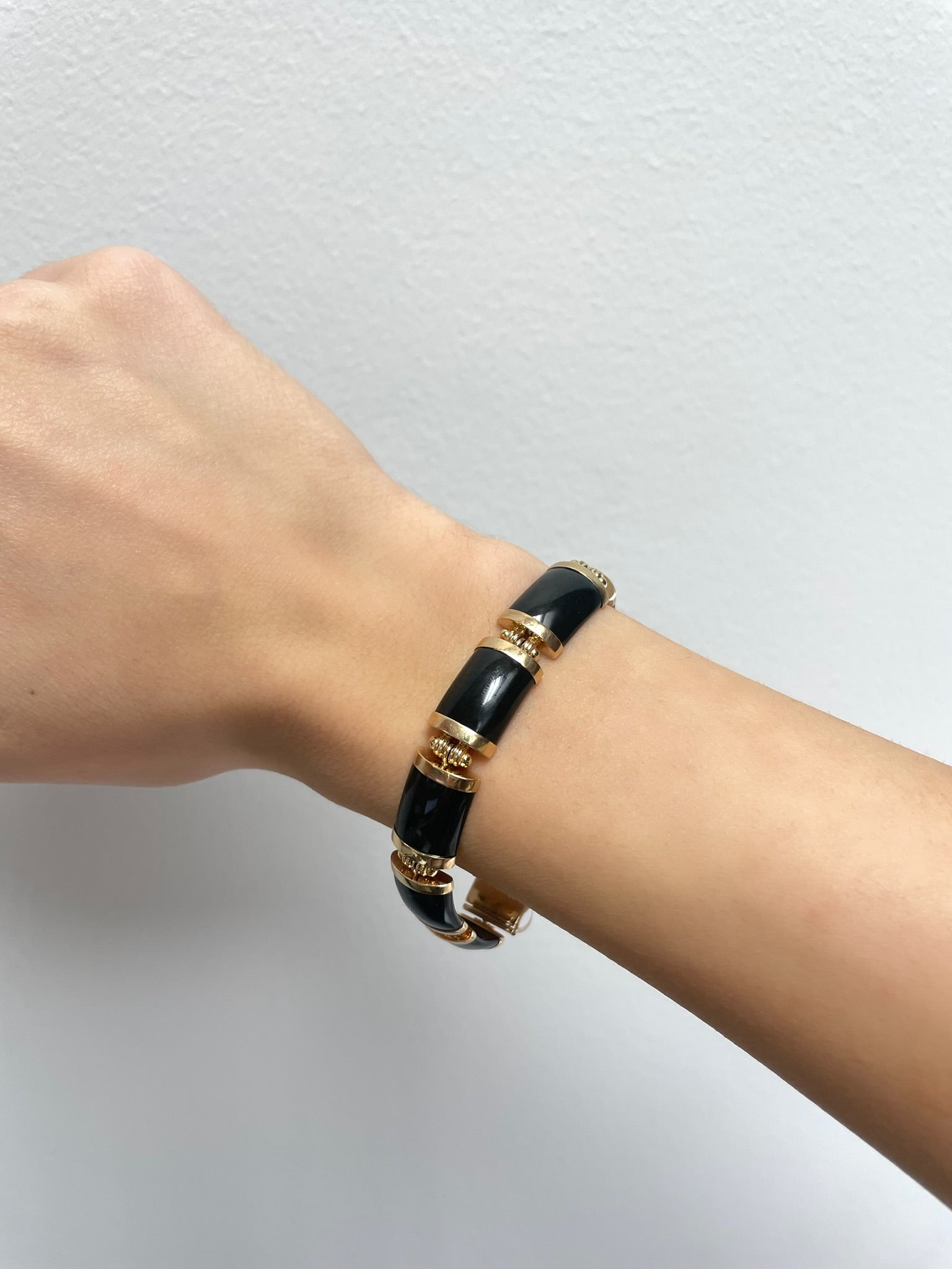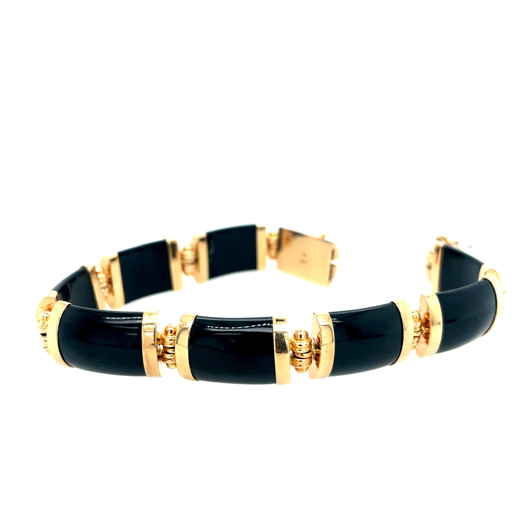 Indulge in luxury with our 14k Yellow Gold Onyx Gold Link Bracelet. Crafted from high-quality, premium materials, this 8-inch bracelet features stunning onyx stones, exquisitely set in a delicate gold link design. Elevate your style with this sophisticated and exclusive piece.