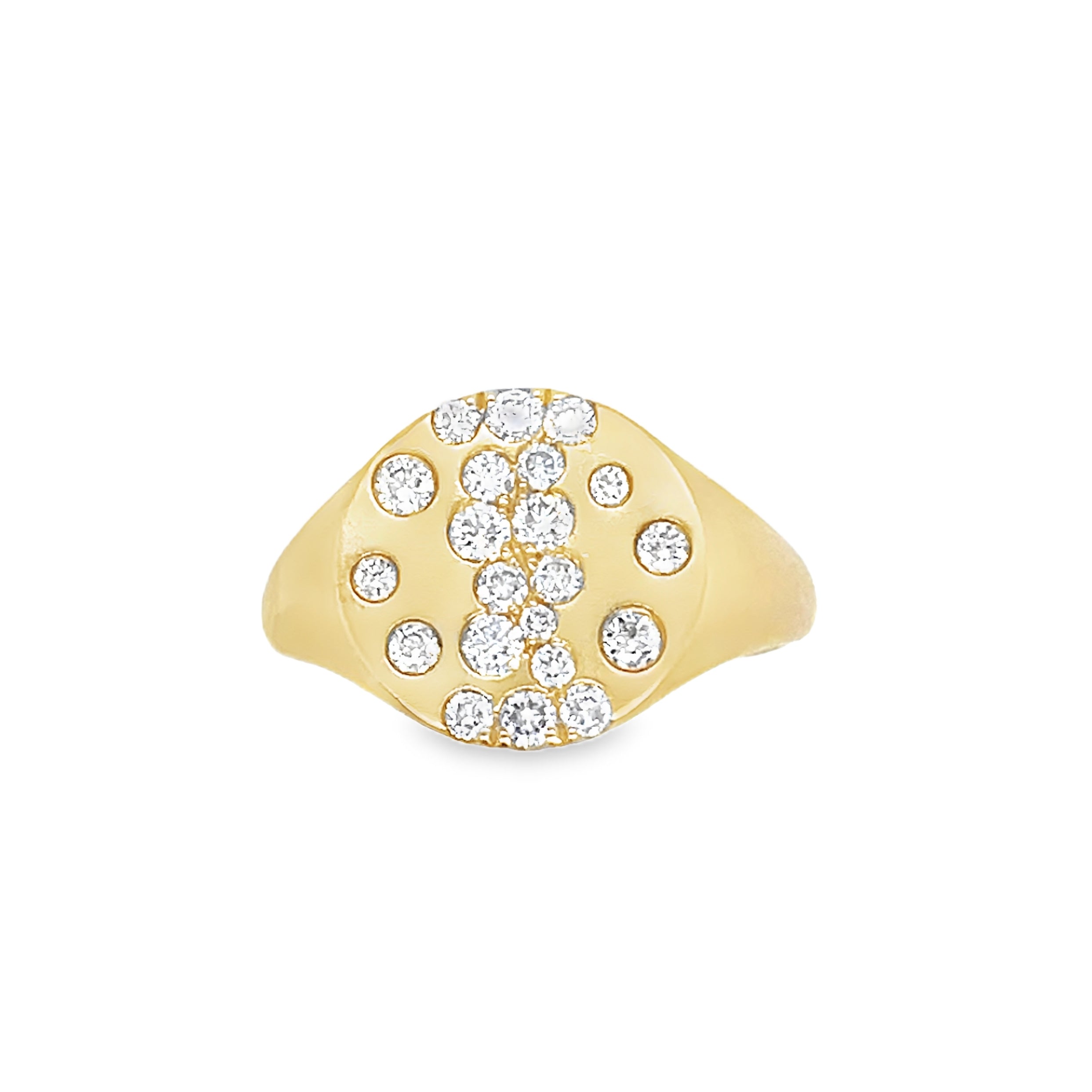 Indulge in this exquisite 14k Yellow Gold Scatter Diamond Circle Ring. Crafted with luxury in mind, this ring features a dazzling circle of scattered diamonds, creating a truly elegant and exclusive look. Perfect for any occasion, this ring is a must-have for those with a sophisticated and refined taste. Available in size 7.
